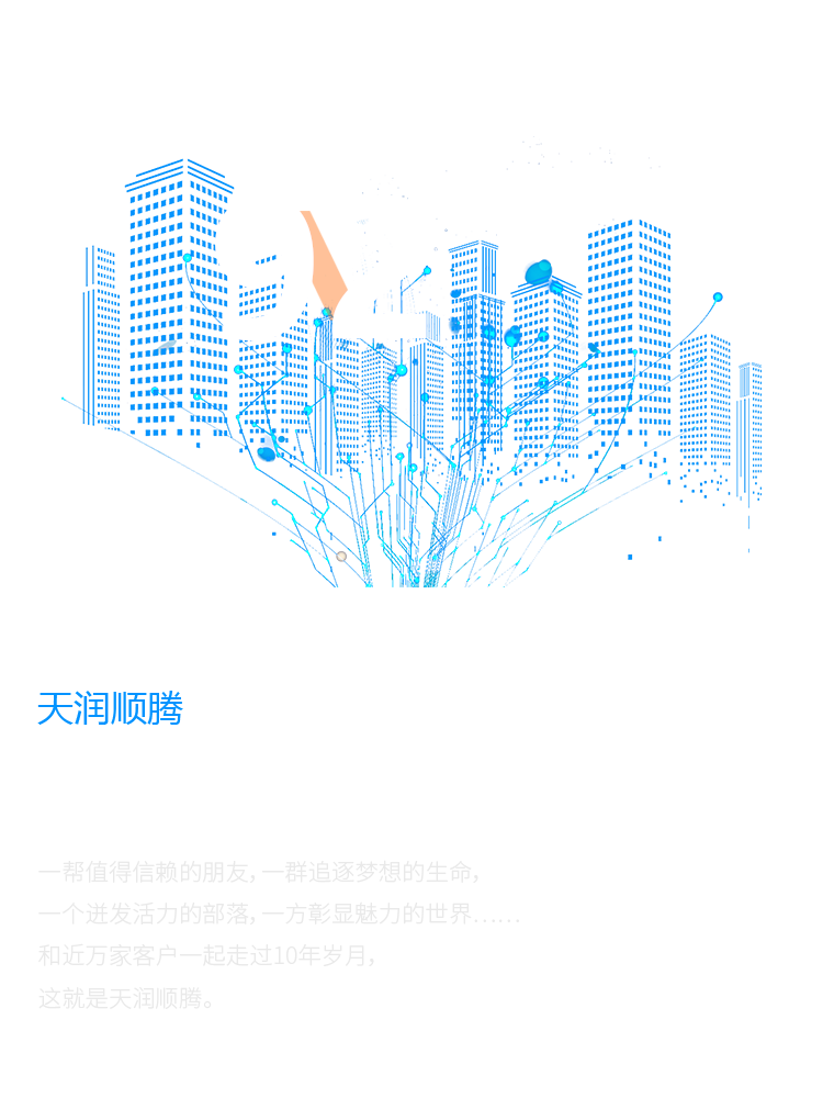 一幫值得信賴的朋友,一群追逐夢想的生命, 一個迸發(fā)活力的部落,一方彰顯魅力的世界…… 和近萬家客戶一起走過10年歲月, 這就是天潤順騰。
